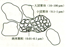 這種基本顆粒;一般是指沒有堆積、絮聯結構的最小顆粒即一次顆粒。而粉體隨著顆粒尺寸的減小,表面活性增大,顆粒之間的靜電吸引力、范德華作用、毛細管作用等較弱的相互作用顯得越來越重要,而形成二次顆粒、三次顆粒等所謂團聚體。如圖4-4所示為粉料中顆粒團聚示意圖,可區分為三個不同尺寸層次的結構:團聚體、顆粒疇和初始顆粒。顆粒疇和初始顆粒的區別通常不考慮,統稱為顆粒。